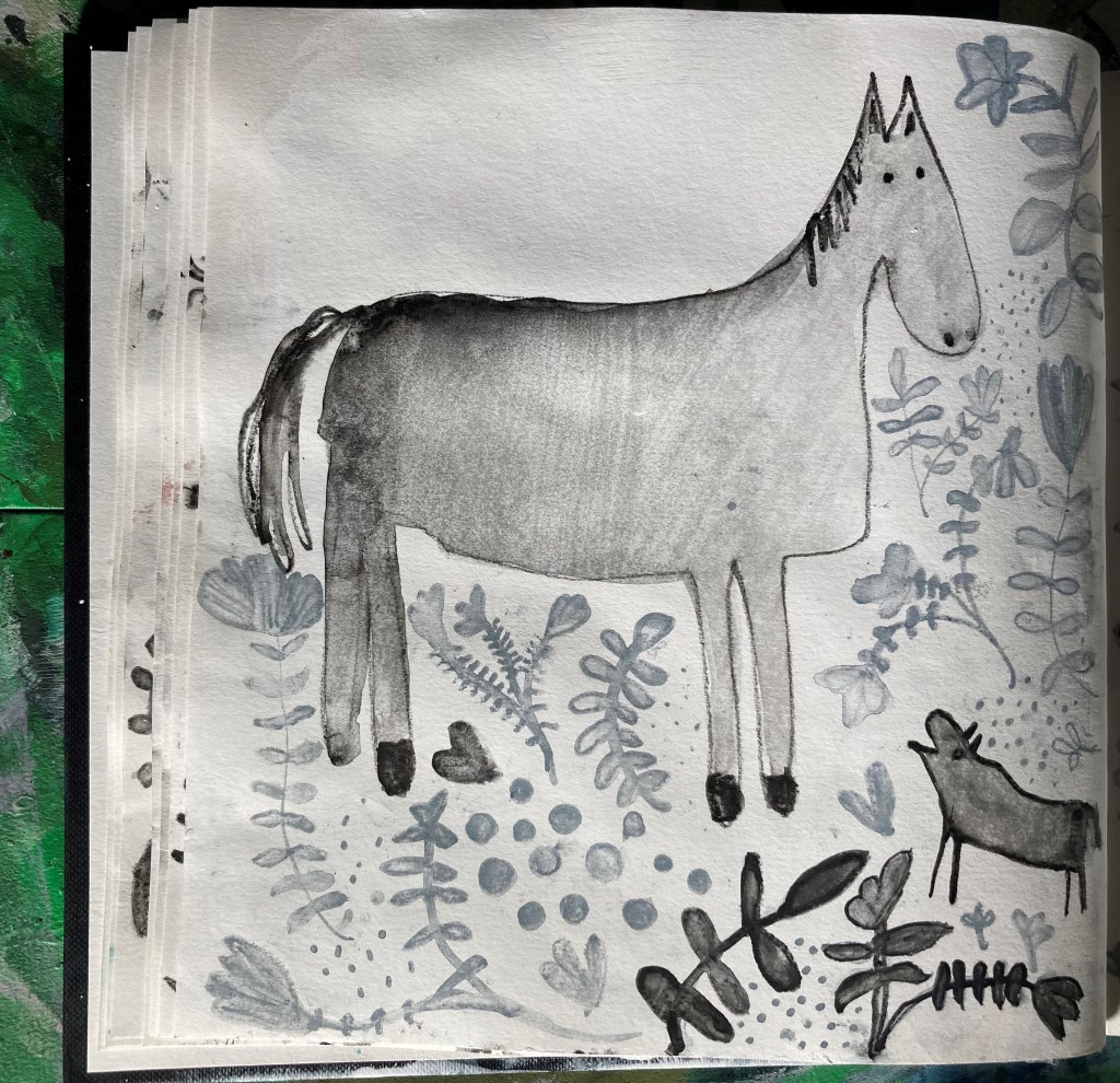I continued drawing horses this week, which has been a pleasure as usual. My goal is to include a horse-like figure in my water paintings, a Kelpie to be precise. The problem is, a Kelpie is a malevolent water-horse that preys on people and drowns them, and my horses all look cute and cheerful. When told my fella I was having trouble making them look sinister, he suggested adding eyebrows. I think you’ll agree I nailed it.